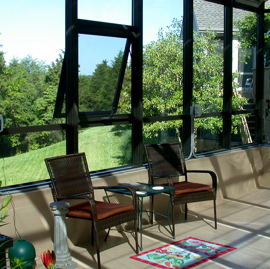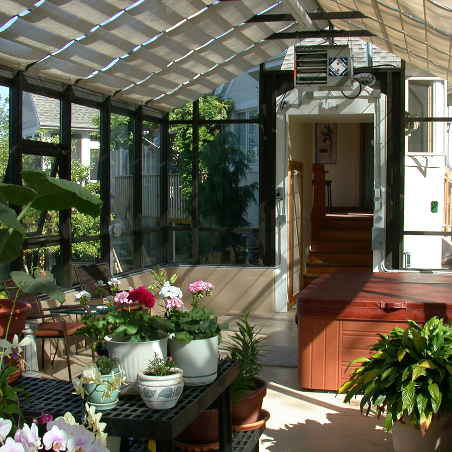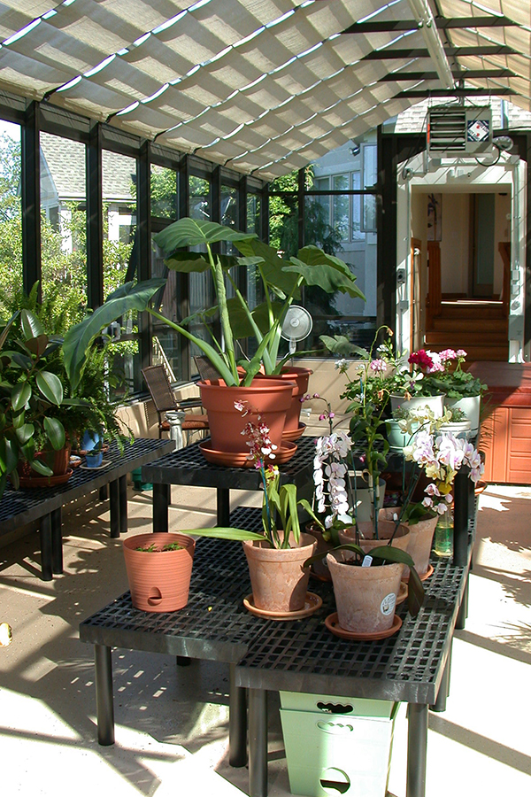 The framework on this greenhouse features built in tracks for sun shades to be installed without additional hardware or drilling. The tracks also provide the ability to have hanging plants or lighting if the homeowners desire.