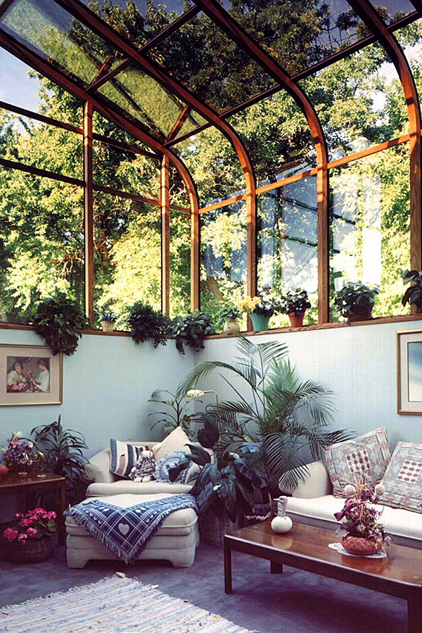Starting alphabetically, a conservatory is a room with a glass roof and walls, attached to a house on one side. It can be used as a greenhouse or a sun parlor. A conservatory is different than a solarium because it has accessories like ridge crests, finials, decorative gutters, decorative rakes, glass spacers, or crown molding. Think of this as the addition of a full room with glass all around, a great space for relaxing, dining, or entertaining. Note that the walls AND roof are glass. Many customers will install automatic sunshades that help control the comfort and light levels inside the conservatory.