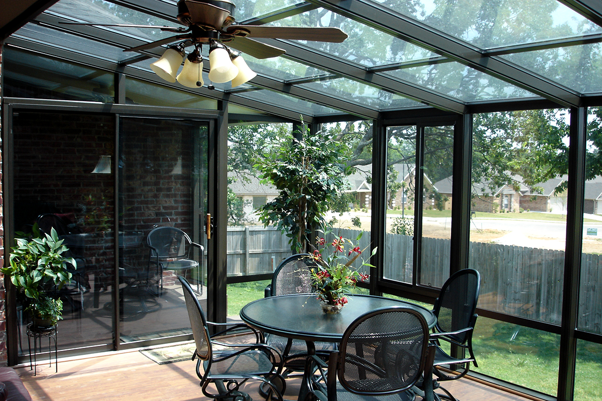 A sunroom is a “sunny room” just as the word implies. While some will define a sunroom as an all-glass structure, it’s really an enclosed patio that makes use of many windows but is not completely made of glass. The windows are usually side by side across all the walls and do not stretch floor to ceiling. The sunroom has a traditional roof like the primary structure. Sunrooms, like solariums, allow people to enjoy the surrounding landscape while being sheltered from the weather however, sunrooms may only be comfortable for three out of four seasons depending on insulation and heating abilities.